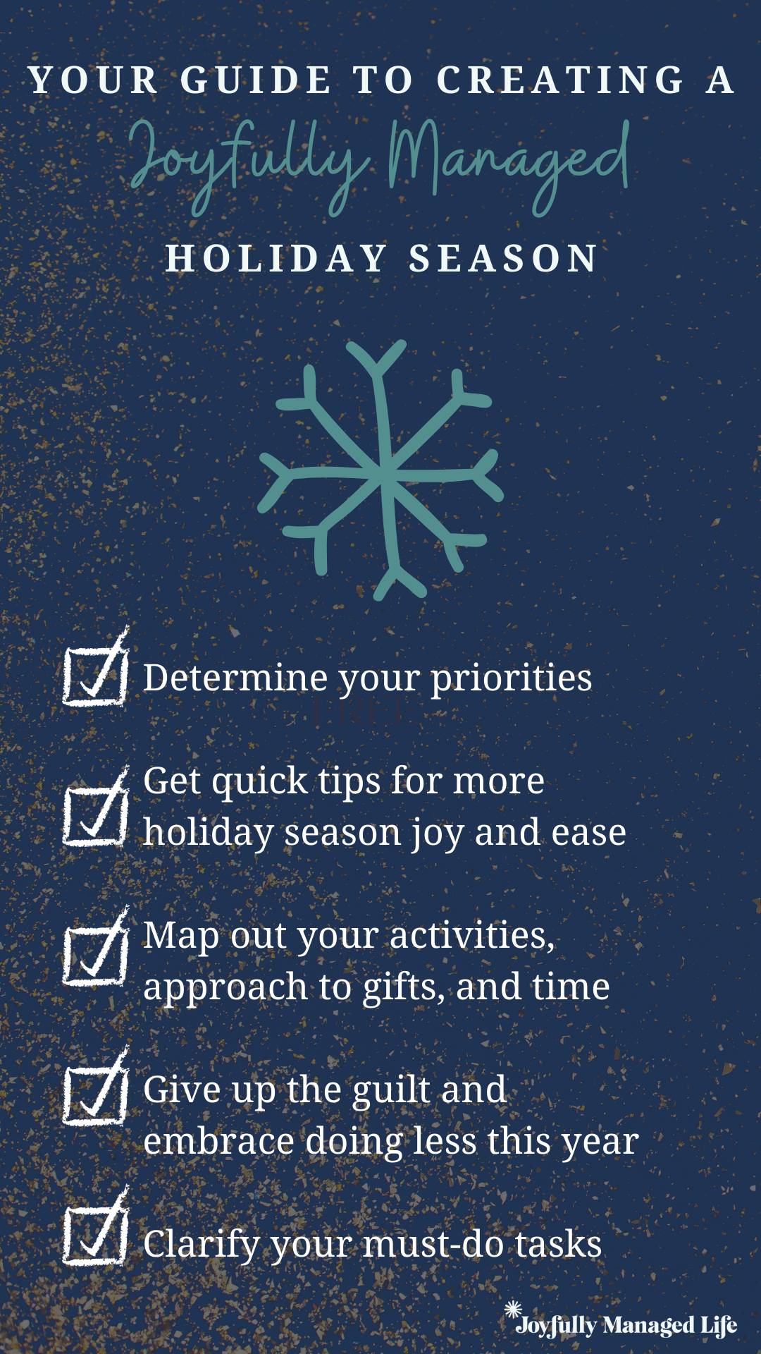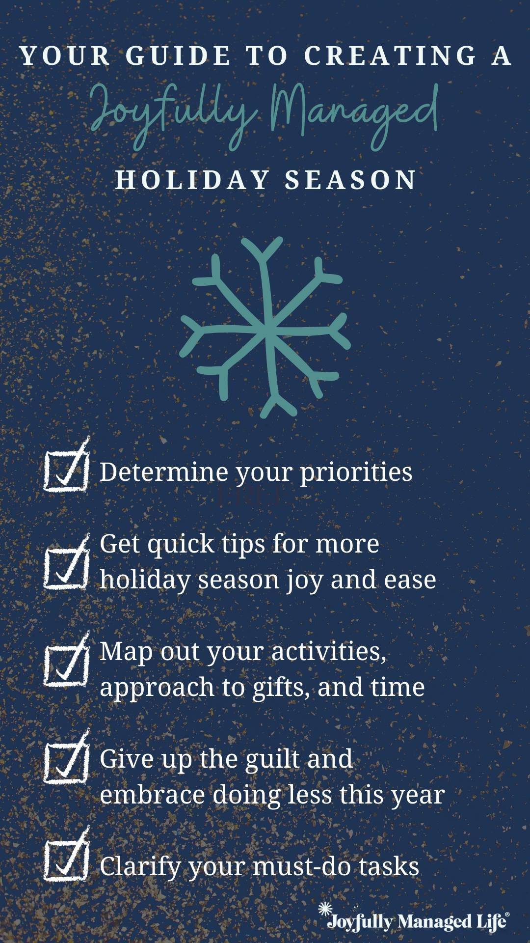 This is a FREE 15-page guide and workbook to help you plan a holiday season that has more joy and ease than overwhelm and stress. It will help you figure out what matters, learn some tips to create more joy and ease, and plan ahead so that you feel completely together when it comes to celebrating this year's fall and winter holidays.